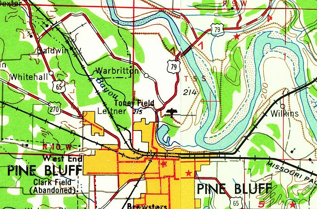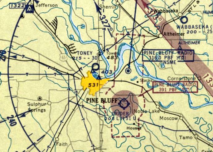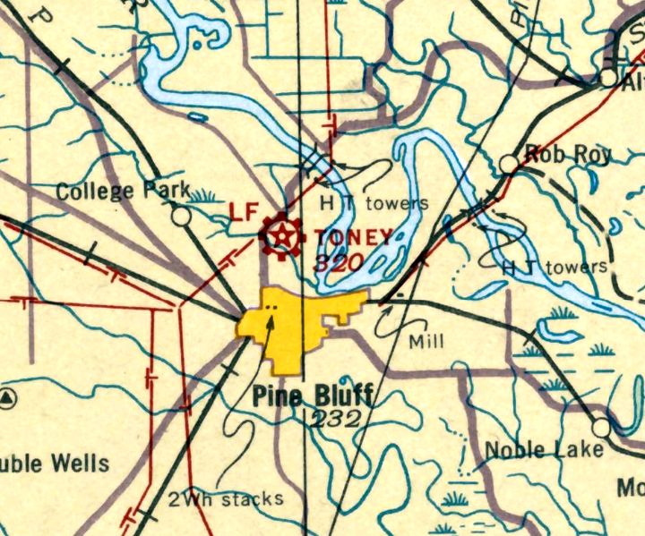 The last aeronautical chart depiction which has been located of Toney Field was on the 1961 Little Rock Sectional Chart.