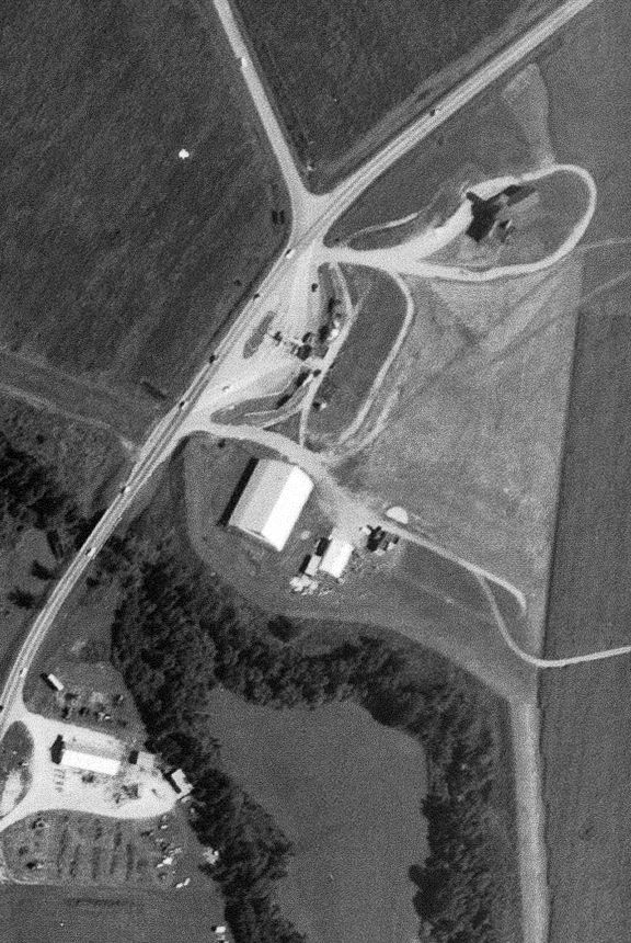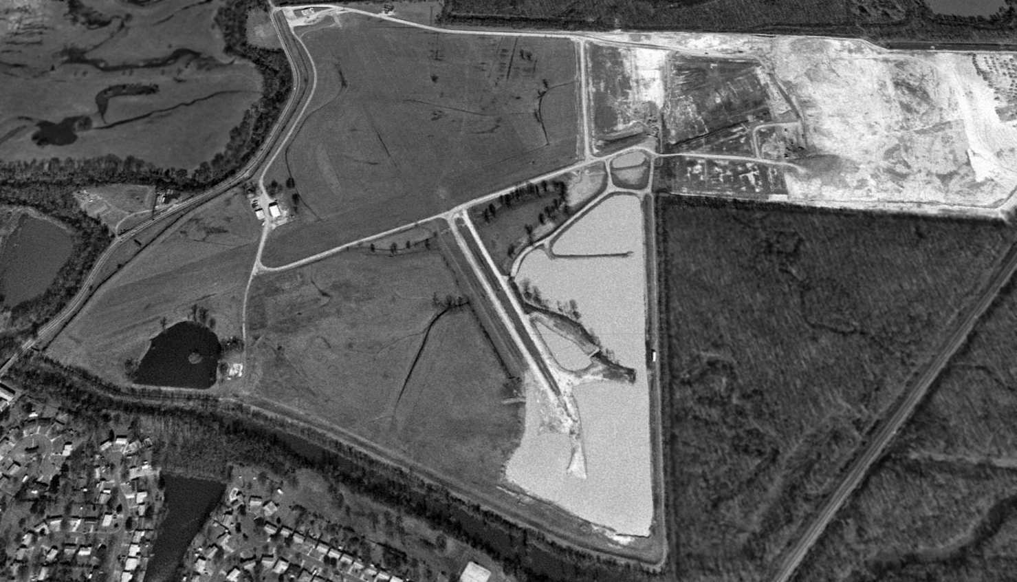 A 1994 USGS aerial view looking north showed the western portions of Worth James Airport's former 2 grass runways were still intact, along with 2 hangars to the northwest of the runway intersection.