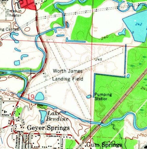 The 1961 USGS topo map depicted “Worth James Landing Field” as having 2 perpendicular unpaved runways,