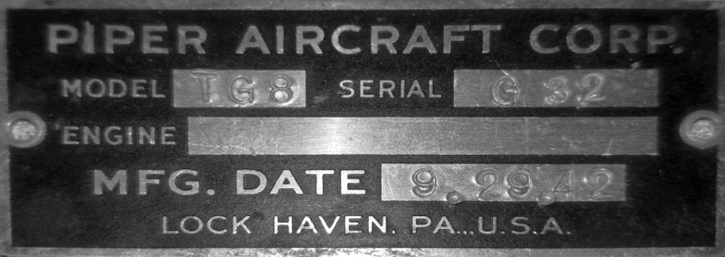 A 2020 photo by Joe Melton of the dataplate from a Piper TG-8 glider from the Lonoke glider training facility.