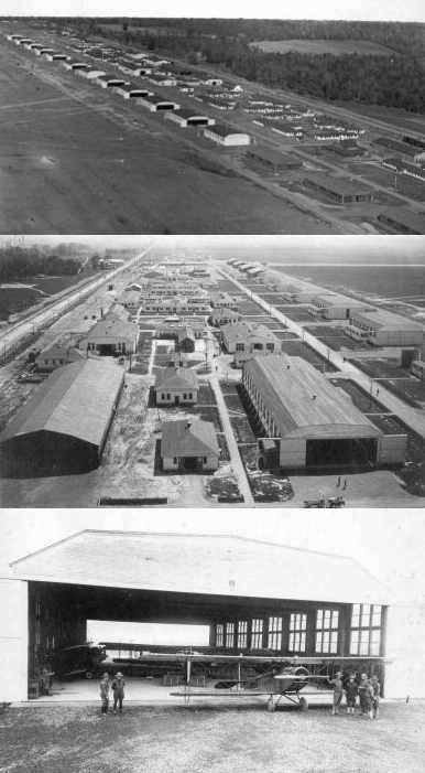 A 1918 Army Signal Corps aerial view looking south along the row of hangars at Eberts Field.