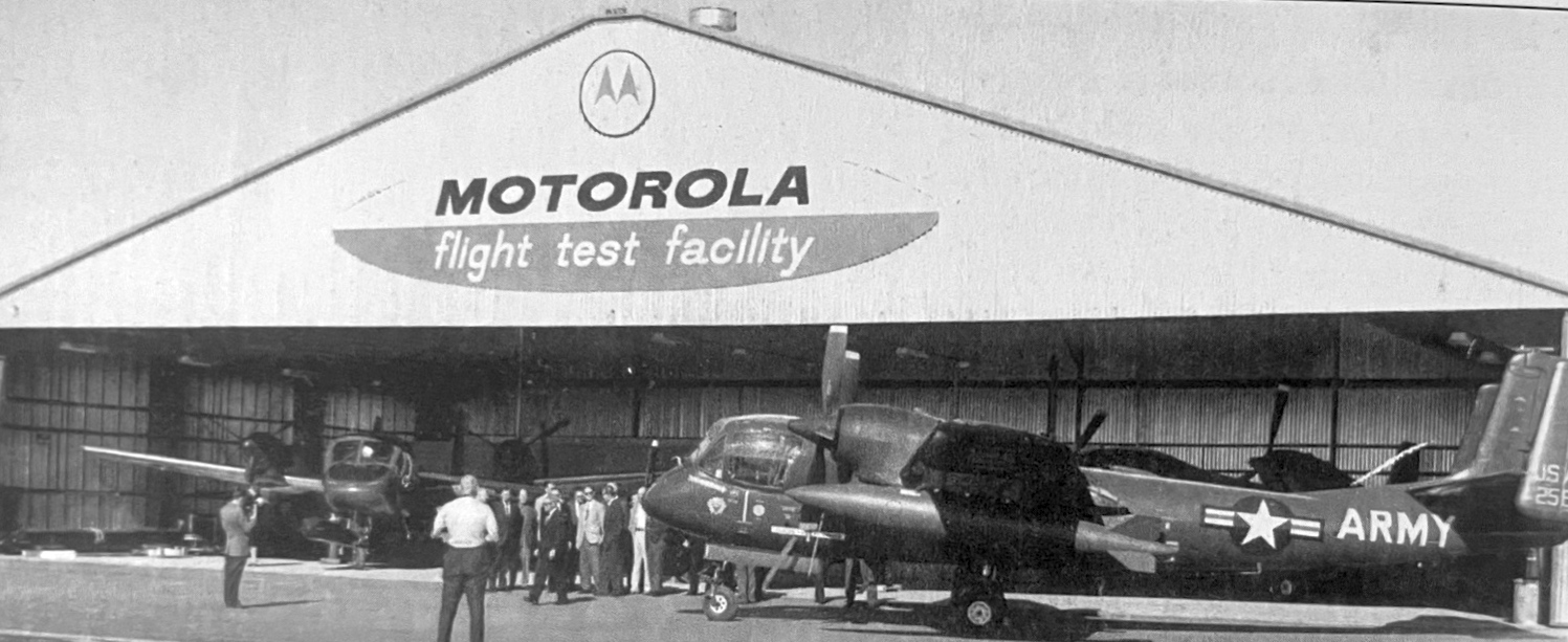 A circa 1960s photo of 3 Army Grumman OV-1 Mohawks in front of a hangar marked “Motorola Flight Test Facility” (courtesy of Kevin Walsh).