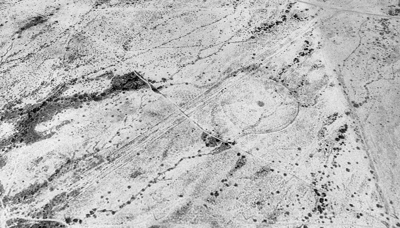 The airfield had 2 dirt oiled runways that were shaped in a V-pattern, oriented east/west & northeast/southwest.”
