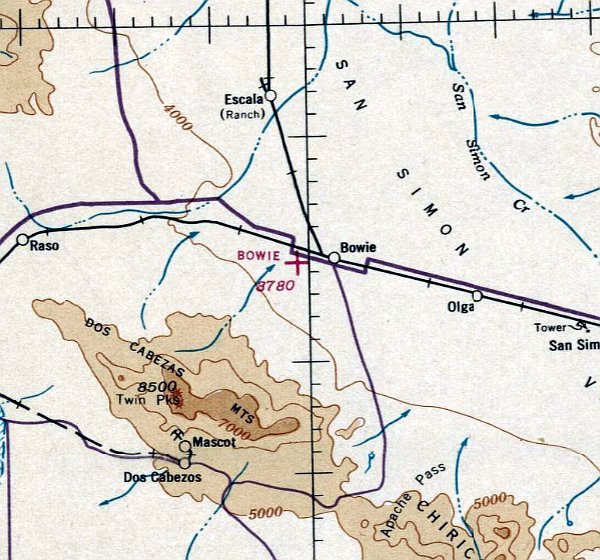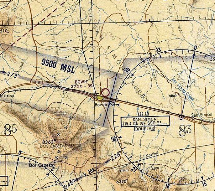 The last aeronautical chart depiction which has been located of the original Bowie Airport was on the March 1956 Phoenix Sectional Chart.
