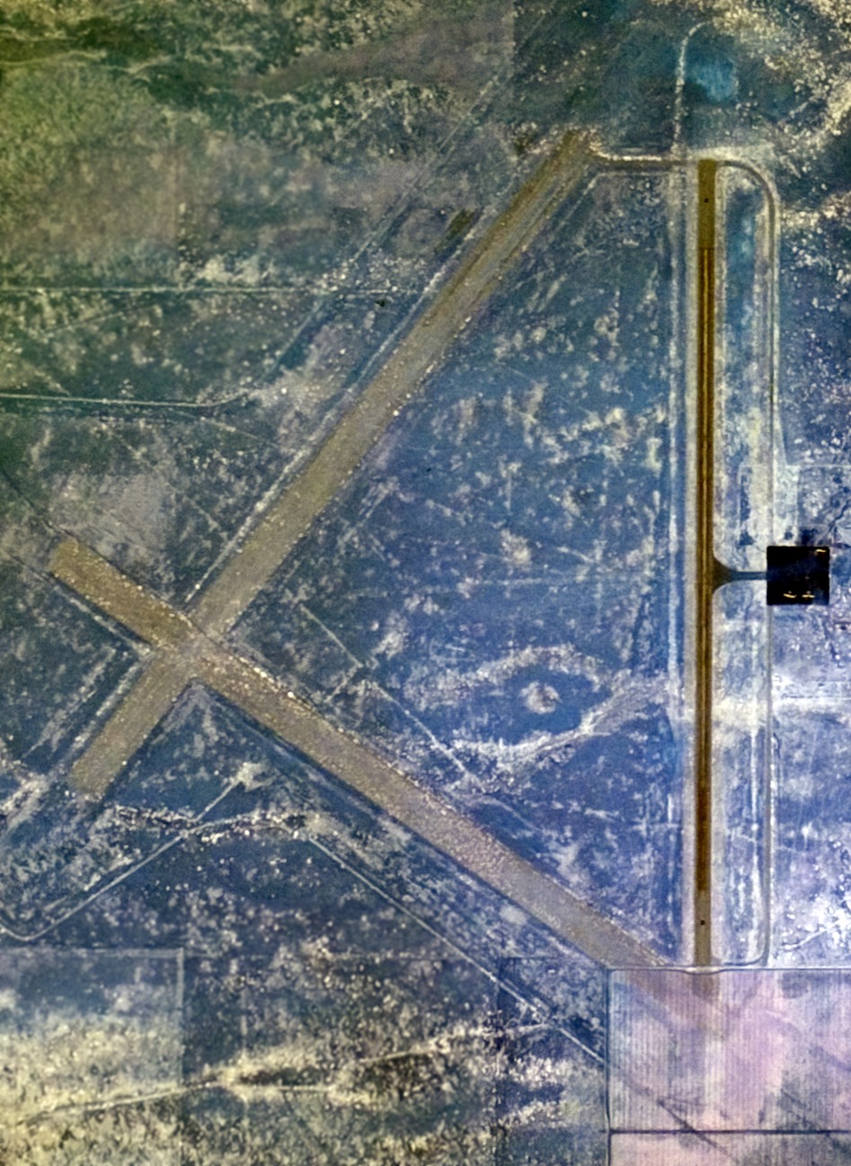 Westbound traffic over time has laid the runway pavement bare, with grass pictured at top now covering runway areas that are located off the road grid.”