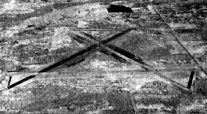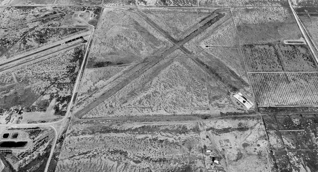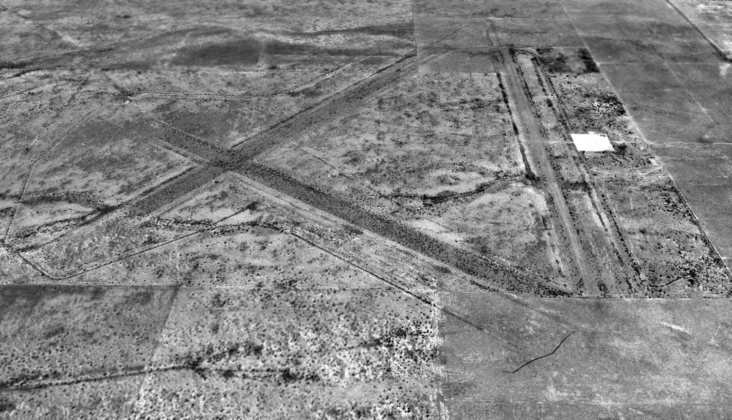 A 1947 aerial view of the site of the original Bowie Airport depicted a cleared dirt square, beyond which extended 2 unpaved runways.