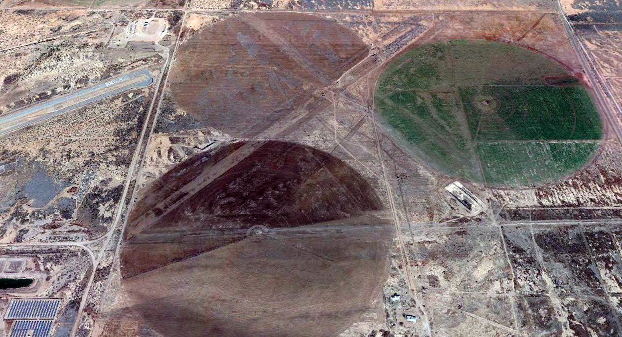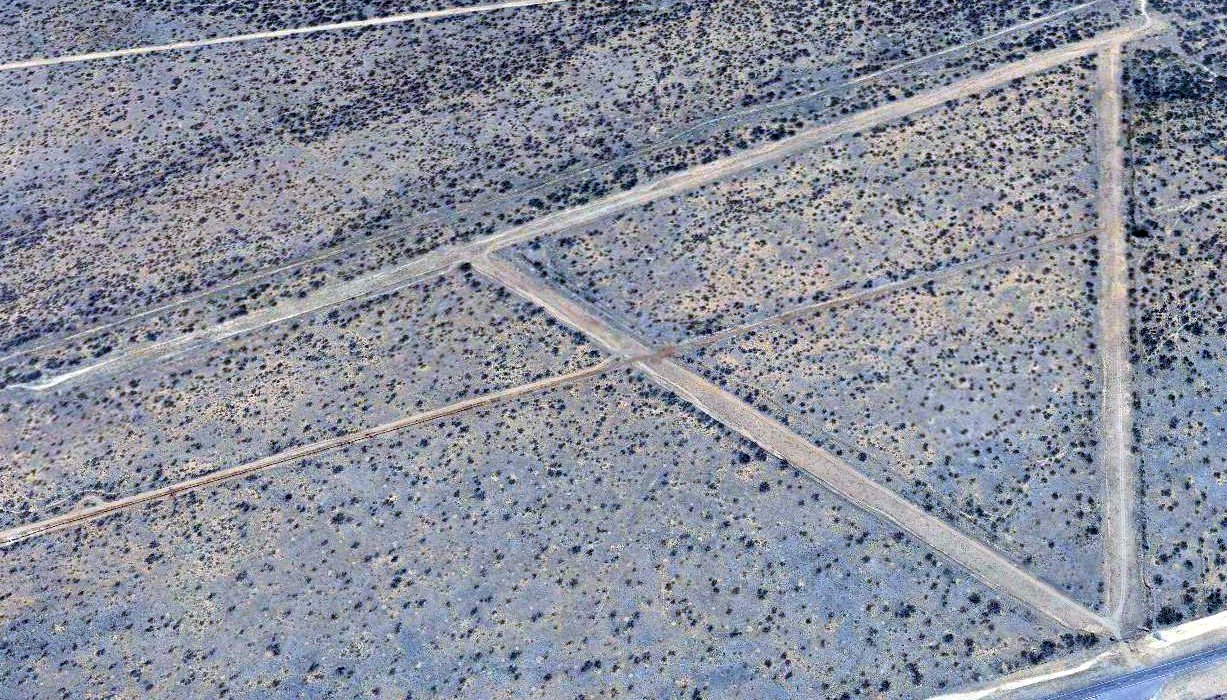 The cracked & exposed runway asphalt, seen on the pic's lower half, lies within another dirt road that heads west.