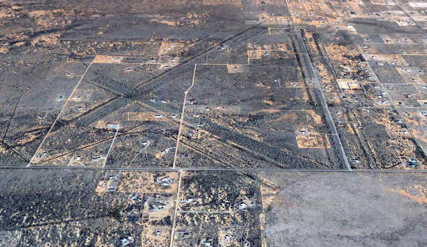 A 2015 aerial view looking northeast showed the remains of the unpaved east/west runway at the site of the 2nd location of Bowie Airport.