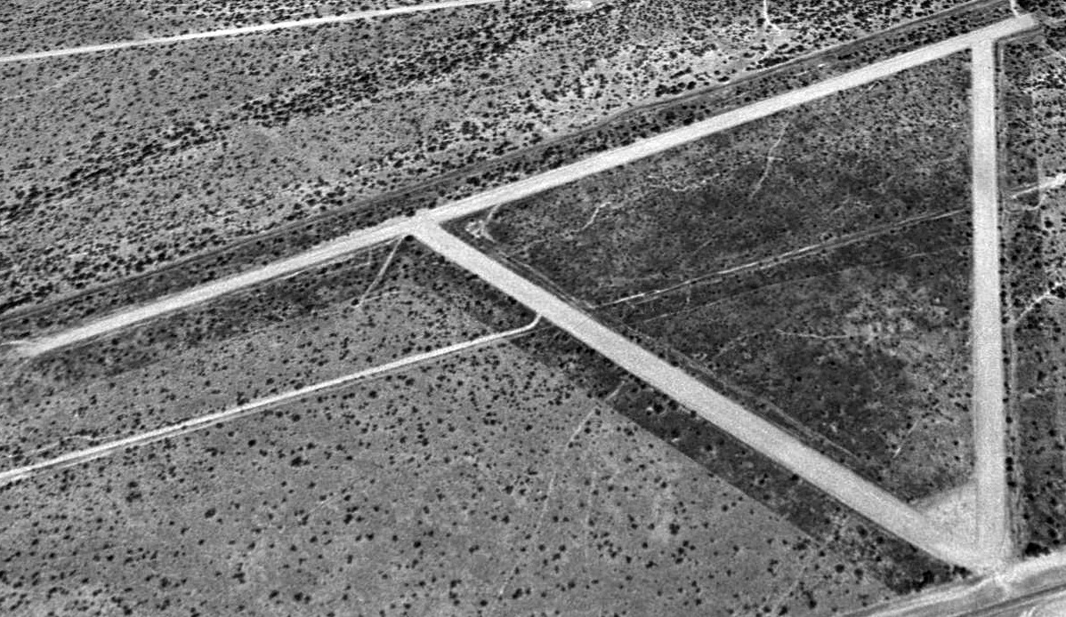 The 1955 USGS topo map depicted 3 paved runways, labeled “Airfield (abandoned)”.