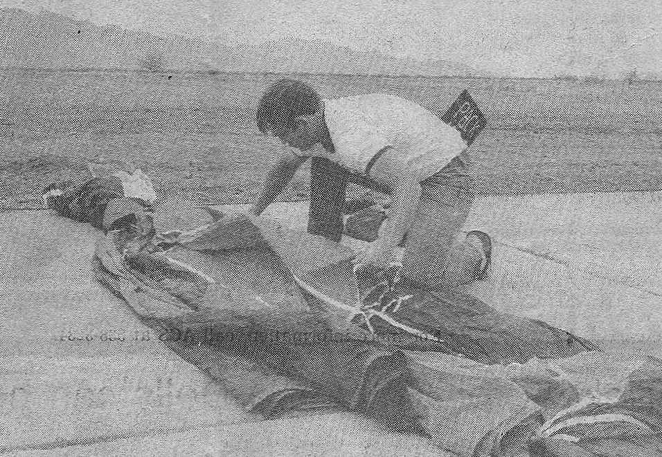 A circa 1976-77 photo (courtesy of Dusty Evers) showing packing of a parachute on the Hereford Airport cement apron,