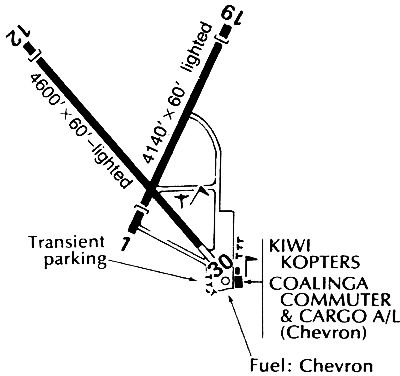 Coalinga was described as having 2 asphalt runways (12/30: 5,280' & 1/19: 4,120'), and the operator was listed as Kiwi Kopters.