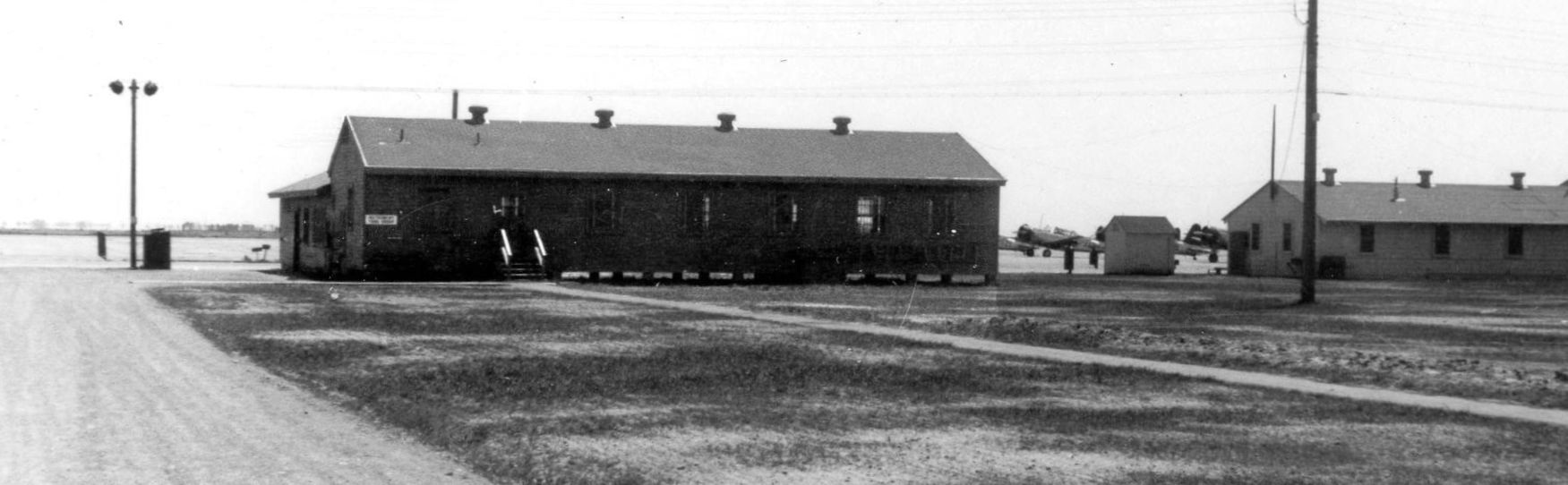 A circa 1942-45 photo of a Lemoore AAF group classroom building, with several Vultee trainers in the background.