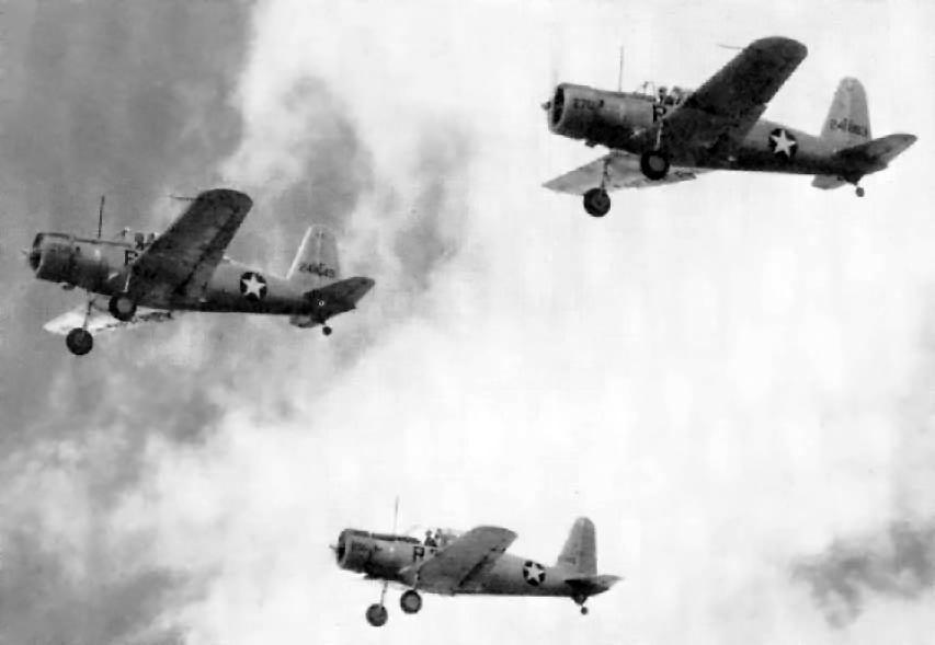 An undated photo of a formation flight of Vultee BT-13 Vibrators from Lemoore AAF