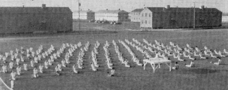 An undated photo of Lemoore AAF cadets conducting physical training, in front of the large number of barracks at the base