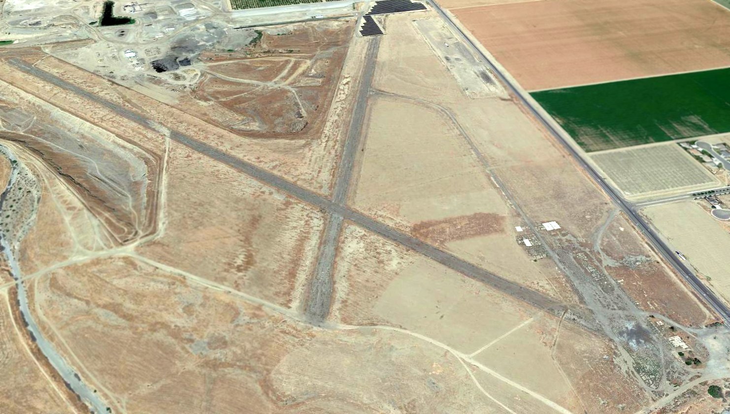A 2015 aerial view looking northeast at the remains of the original Coalinga Municipal Airport.