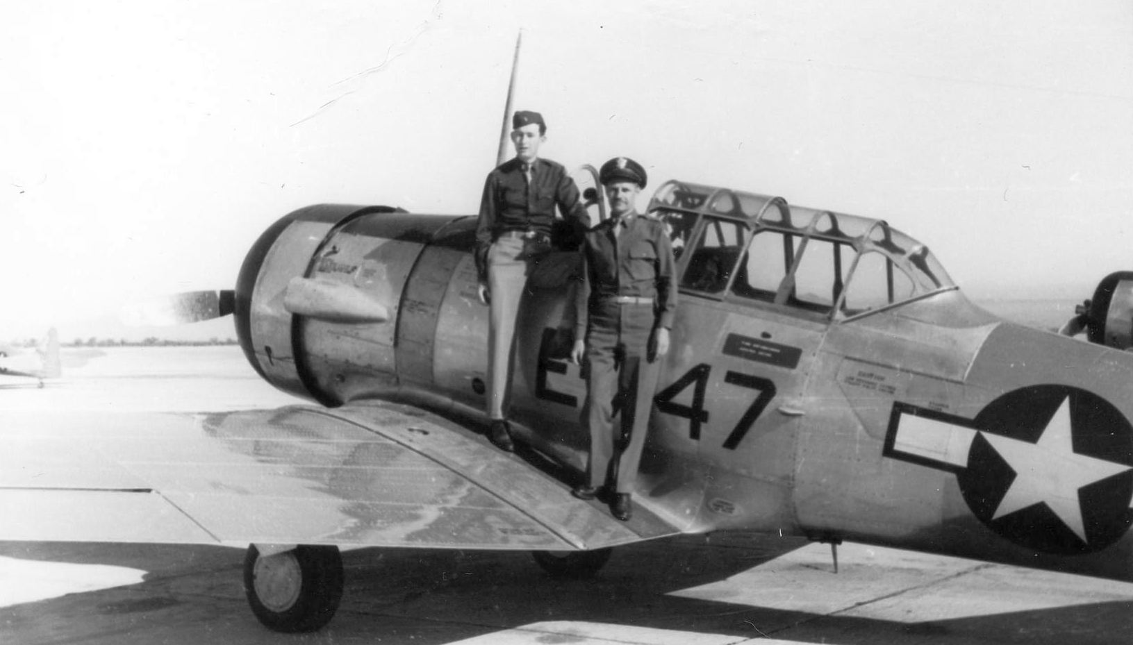 A circa 1942-45 photo of flight instructor George Baldrick & another officer on a North American AT6 Texan at Lemoore AAF.