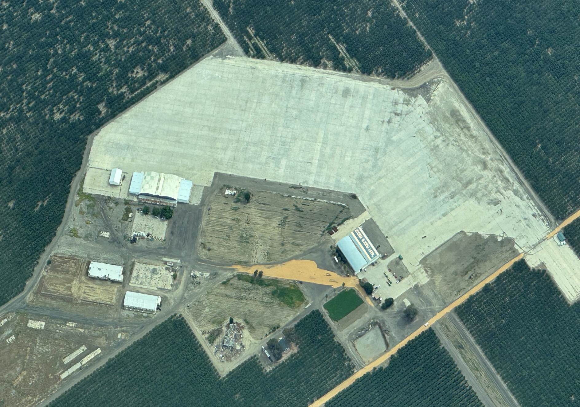 A 5/5/13 aerial view by Dallam Oliver-Lee looking northwest at the remains of the original Coalinga Municipal Airport, showing the foundations of the hangars at the southeast corner of the site.