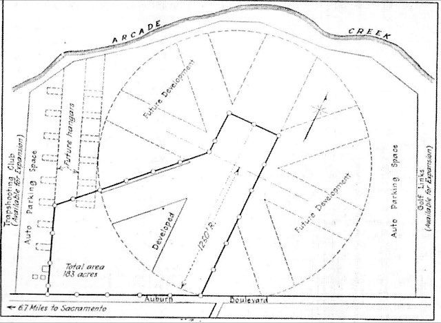 A map from the 7/19/28 Engineering News (courtesy of Dann Shively) a possible expansion of Del Paso Airport if it had been chosen for development as Sacramento's municipal airport.