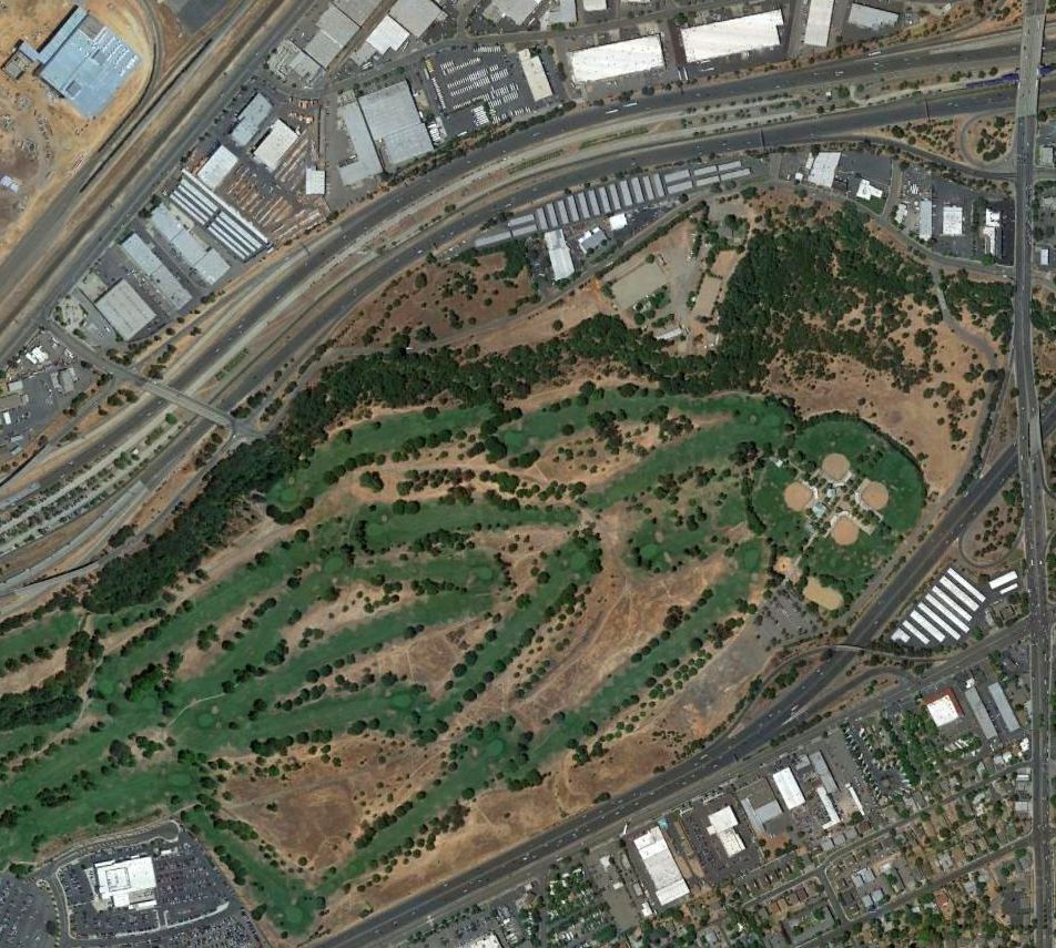 A 2016 aerial view shows the site of Del Paso Airport to be occupied by the Haggin Oaks Golf Complex & Del Paso Park.