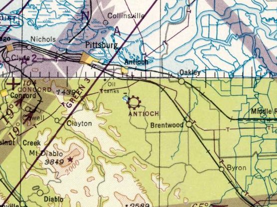 The last aeronautical chart depiction which has been located of the Antioch Airport was on the 1990 San Francisco Sectional Chart (courtesy of Dann Shively).