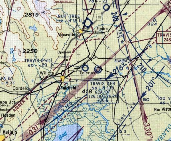 The earliest aeronautical chart depiction of the Travis Aero Club Airport which has been located was on the April 1958 Sacramento Sectional Chart.