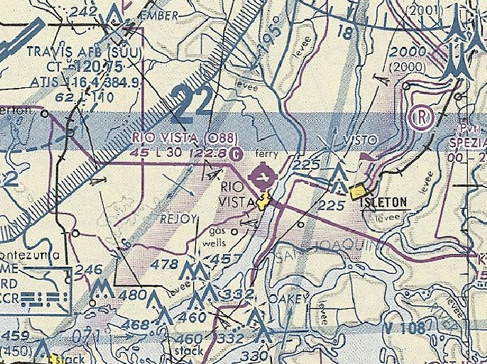 The last aeronautical chart depiction of Rio Vista Airport which has been located was on the October 1993 San Francisco Sectional Chart.
