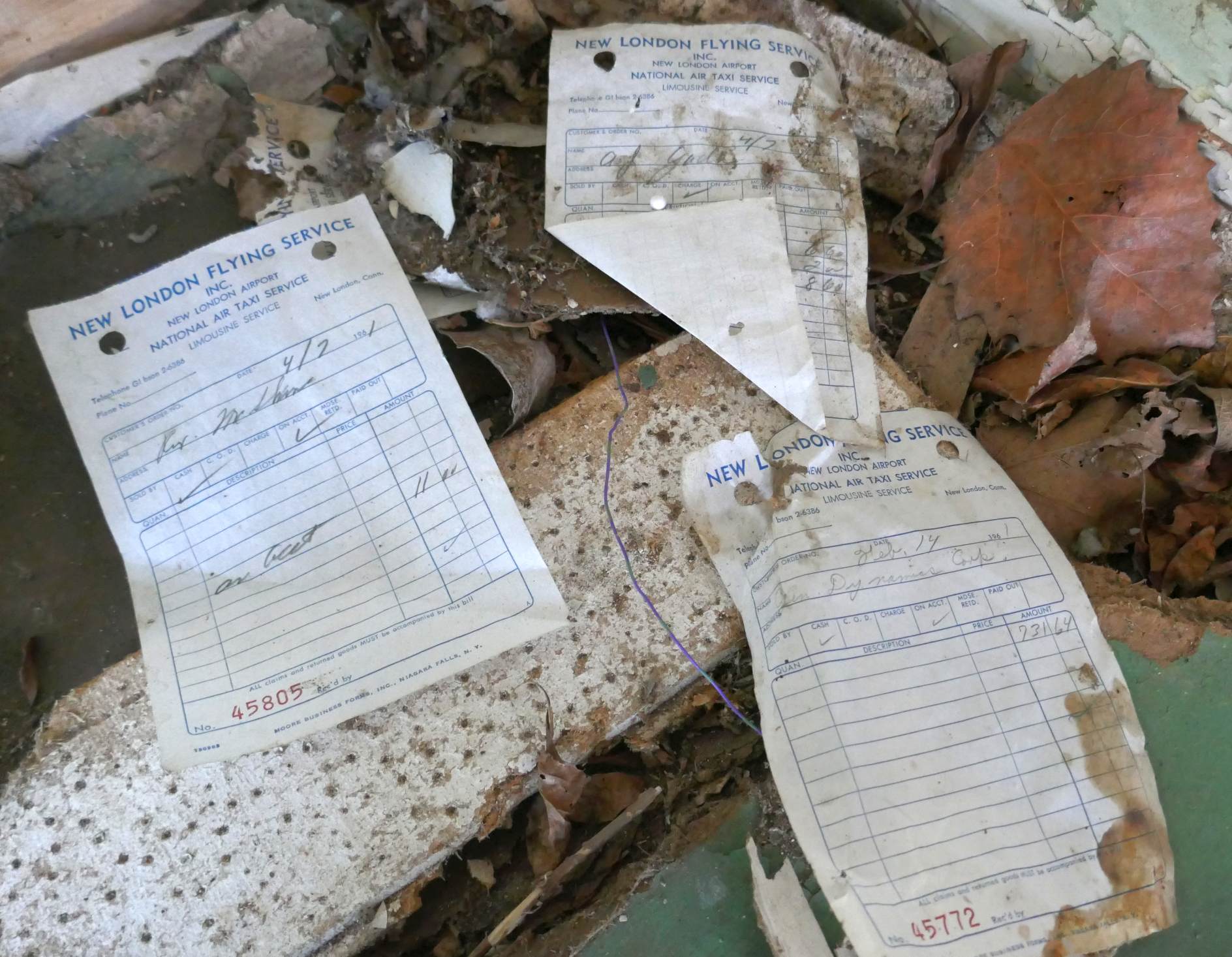 A 3/9/20 photo by Michael LaRose of 1961 New London Flying Service receipts laying scattered at the New London Airport site.