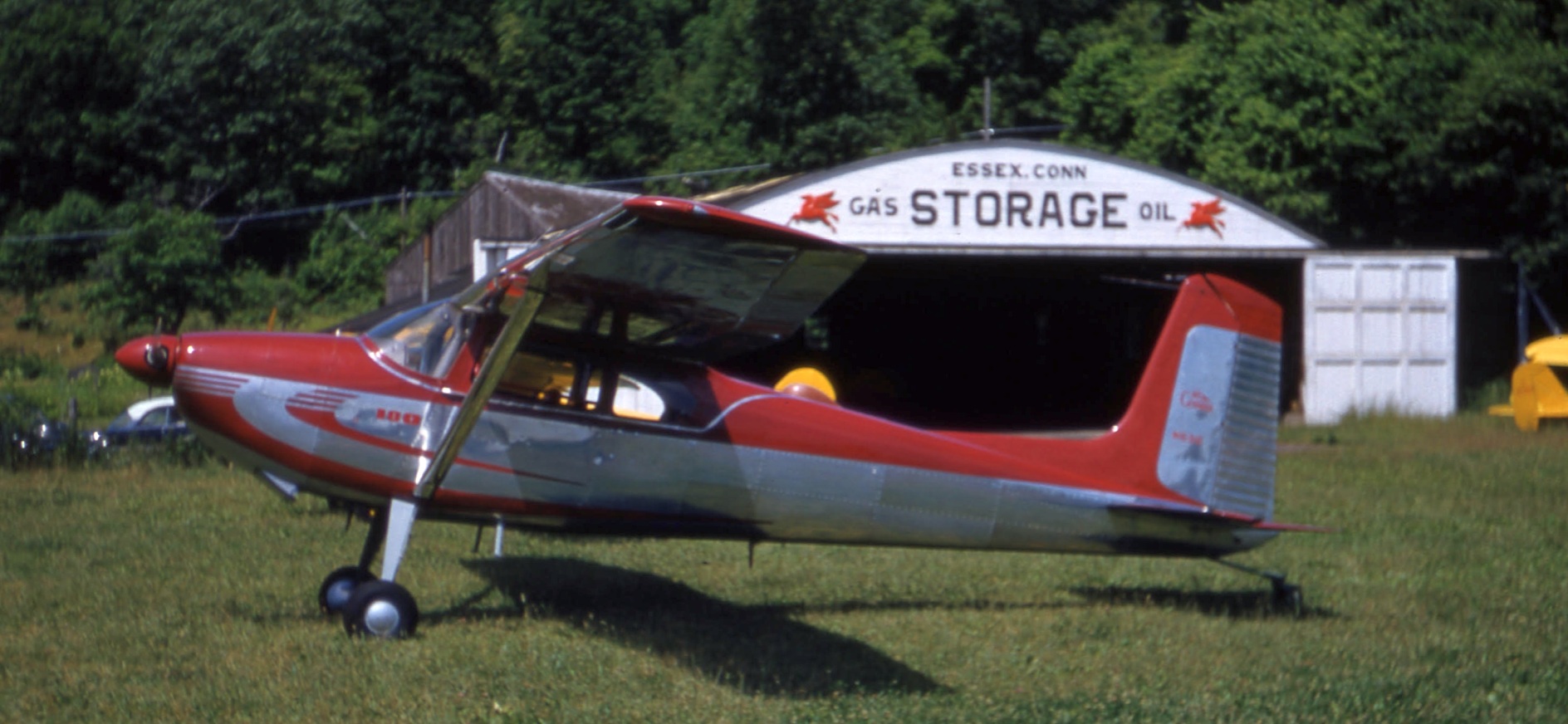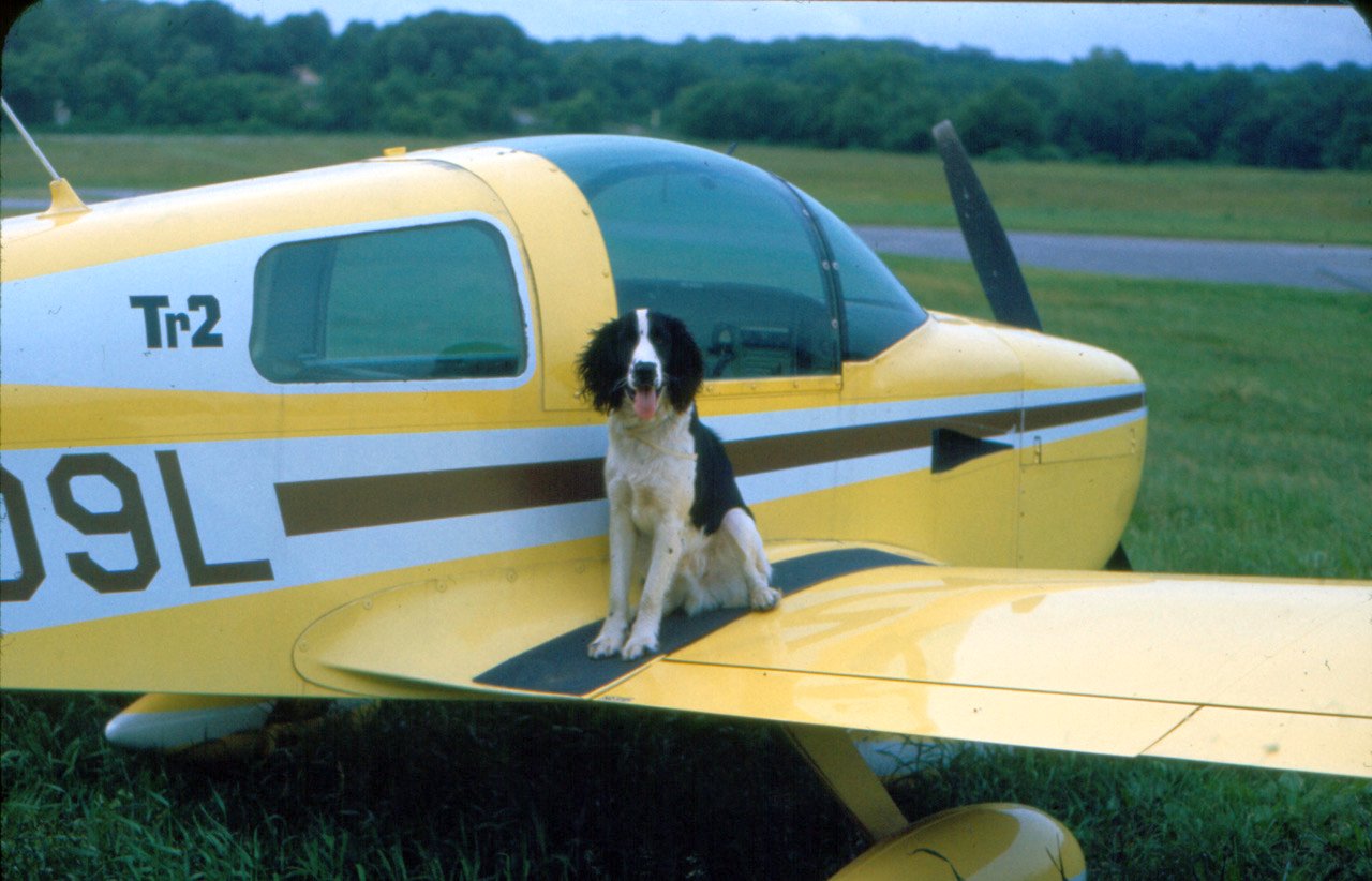 A circa 1975 photo by Ted Frison of his Grumman AA1B at Waterford Airport. Ted reported, his “copilot was Sludge dog. Dumb as dirt, but loved to fly.”