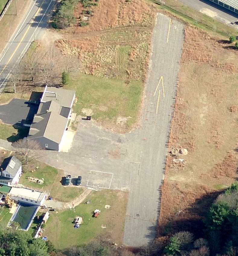 A circa 2008-2011 aerial view looking west showed the sole building remaining at the site of New London Airport, with the remains of the runway pavement in the foreground.