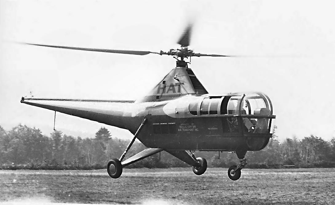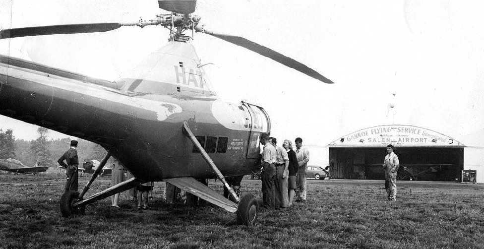 An October 1946 of a Sikorsky R-5 helicopter of Helicopter Air Transport at Salem Airport, with the Gannoe Flying Service hangar visible in the background (courtesy of Charles Czajkowski).