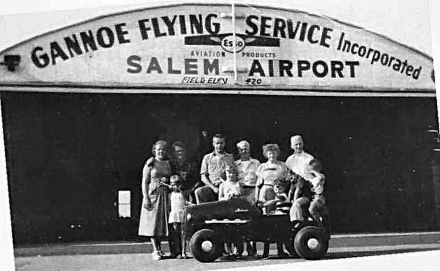 An undated photo of Raymond Gannoe (2nd from left) with family & airport workers in front of Salem Airport's Gannoe Flying Service hangar.