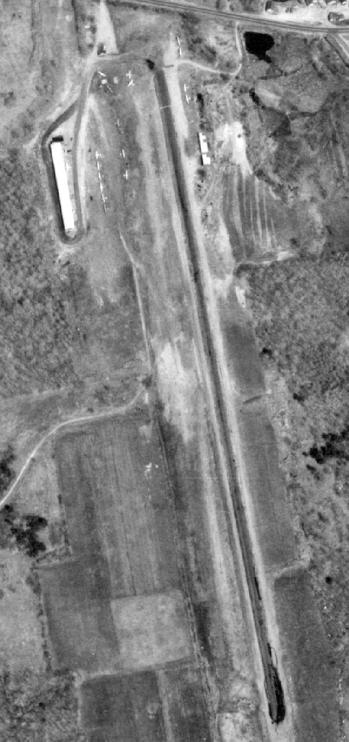 It depicted a single northwest/southeast runway, with 16 light aircraft & several hangars on the north side.