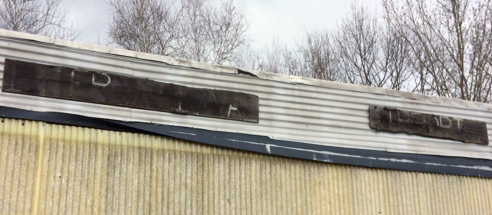 A 4/5/20 photo by Alex T.D. of the sign above the right hangar at the site of Mountain Meadow Airport, which appears to have said “Interstate Airport”,