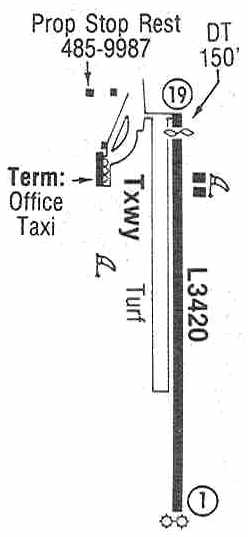 Two hangars were depicted on the east side of the runway, along with the Prop Stop Restaurant on the southwest side, and the terminal & office on the west side of the field.