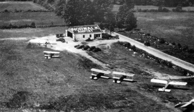 A circa 1930s aerial view depicted 6 single-engine aircraft next to a hangar labeled “Norwalk Airport”.