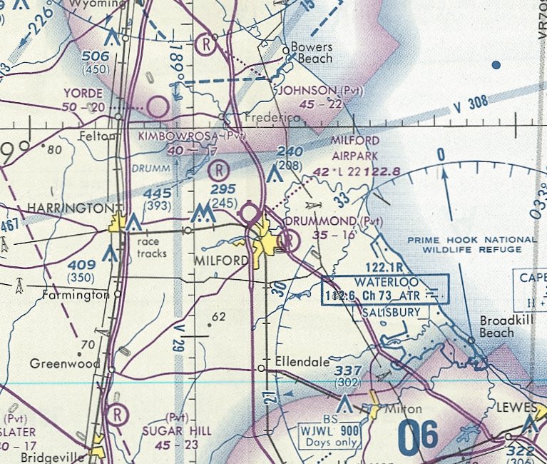 The last aeronautical chart depiction which has been located of Rehoboth Airport was on the March 1981 Washington Sectional Chart (courtesy of Ron Plante).