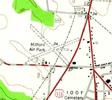 The 1954 USGS topo map depicted “Milford Air Park” as having 2 unpaved runways, and several small buildings to the south & east.