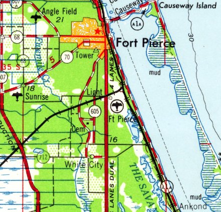It depicted Ft. Pierce Airport as having 3 unpaved runways, with an airport circular marking in the northwest corner.