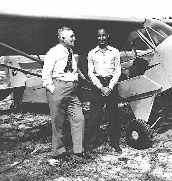 A 1946 photo of William Piper (founder of Piper Aircraft) & Maynard Abrams (manager of Hollywood Airpark) in front of a Piper Cub at Hollwood Airpark.