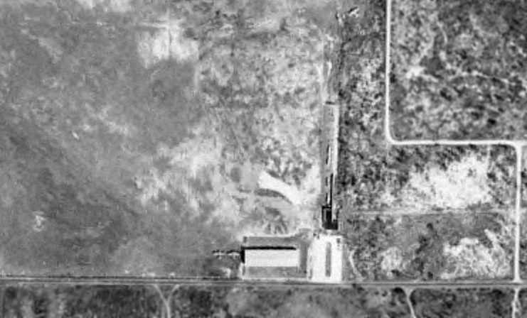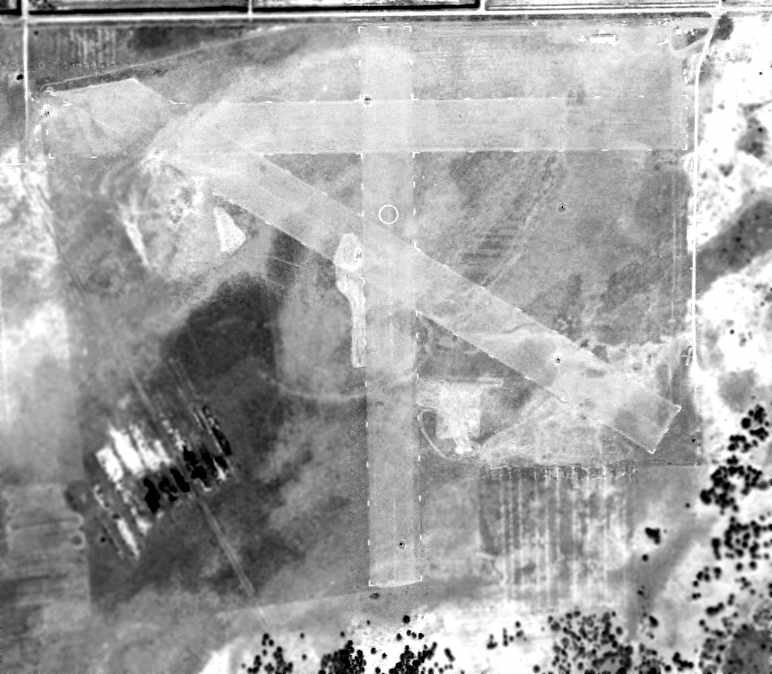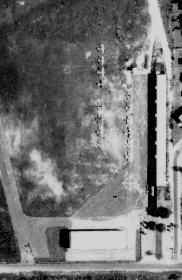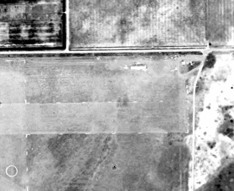 with a cluster of a few small buildings & hangars on the southeast corner of the field.