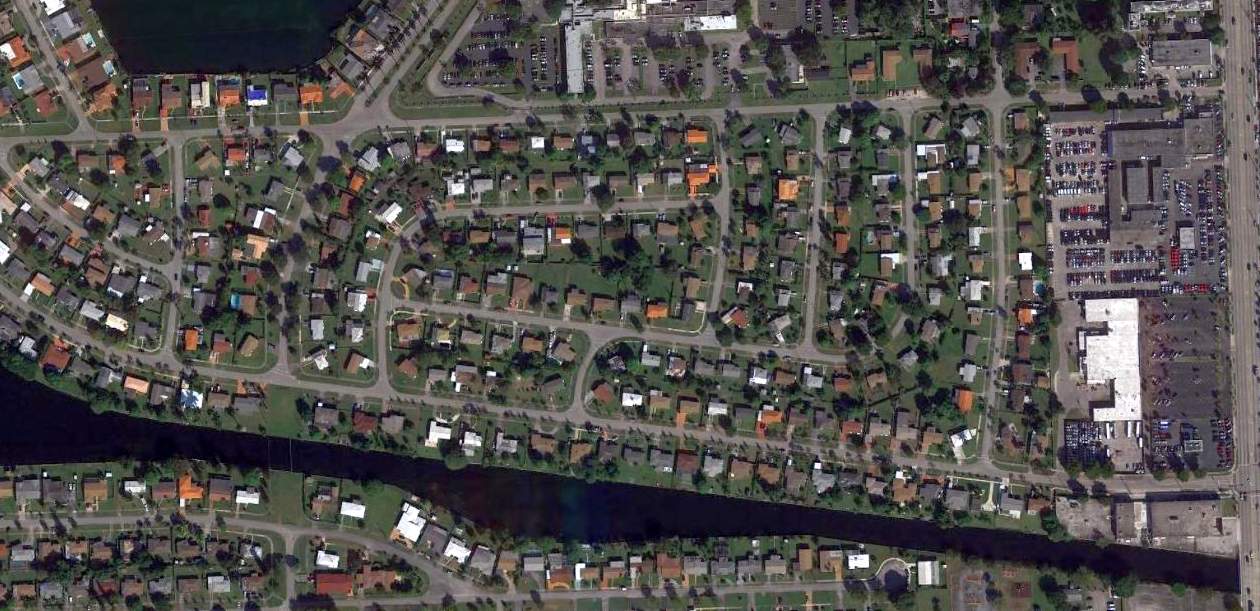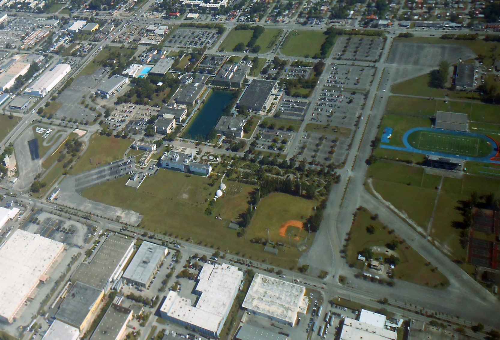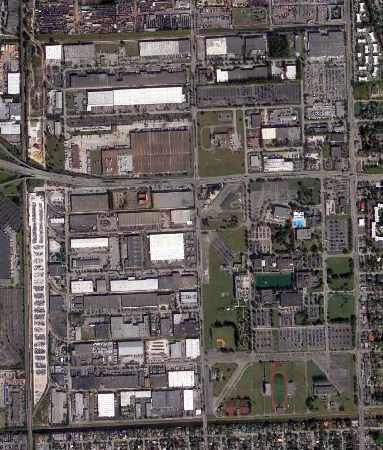 A 2014 aerial view looking southwest depicted the former Opa-Locka West Airport after its closure, with the former Runway 18/36 having been reused as a drag strip.