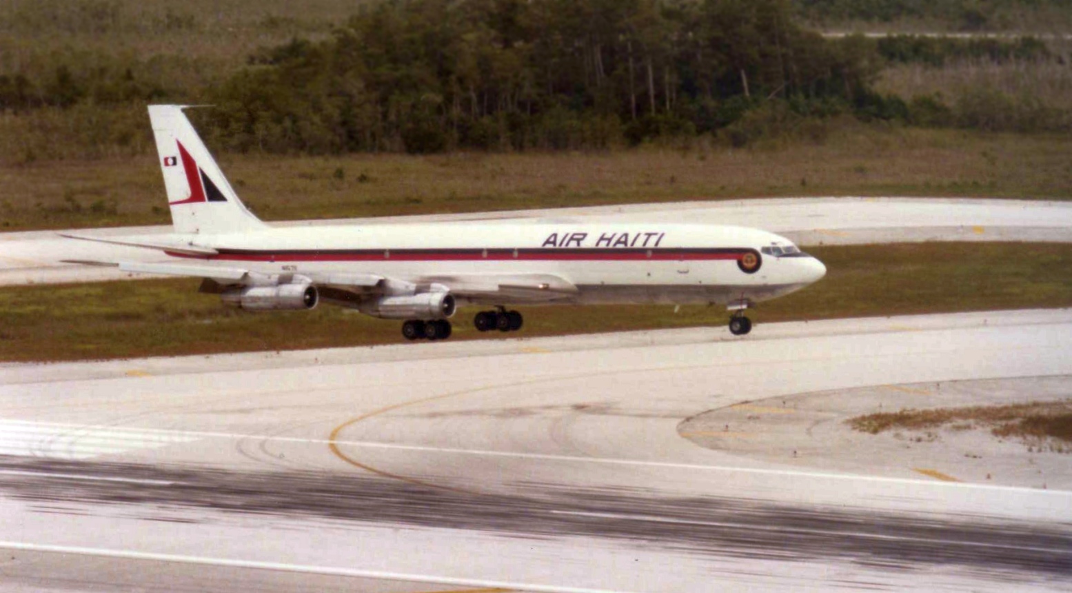 A 7/10/13 photo of a Boeing Air Haiti 707 on approach to the Dade-Collier runway during a training flight.