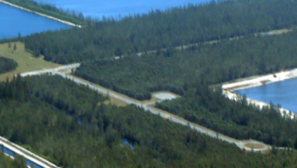 An undated (circa 1970s?) aerial view looking east over the newly-constructed single runway of the Everglades Jetport.