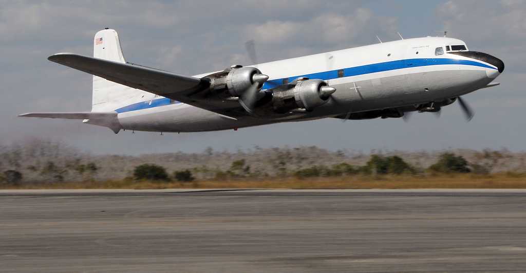A 1/25/13 photo by Ralph Peterson of a DC-6A making a low pass down the Dade-Collier runway during testing of aircraft spray systems.