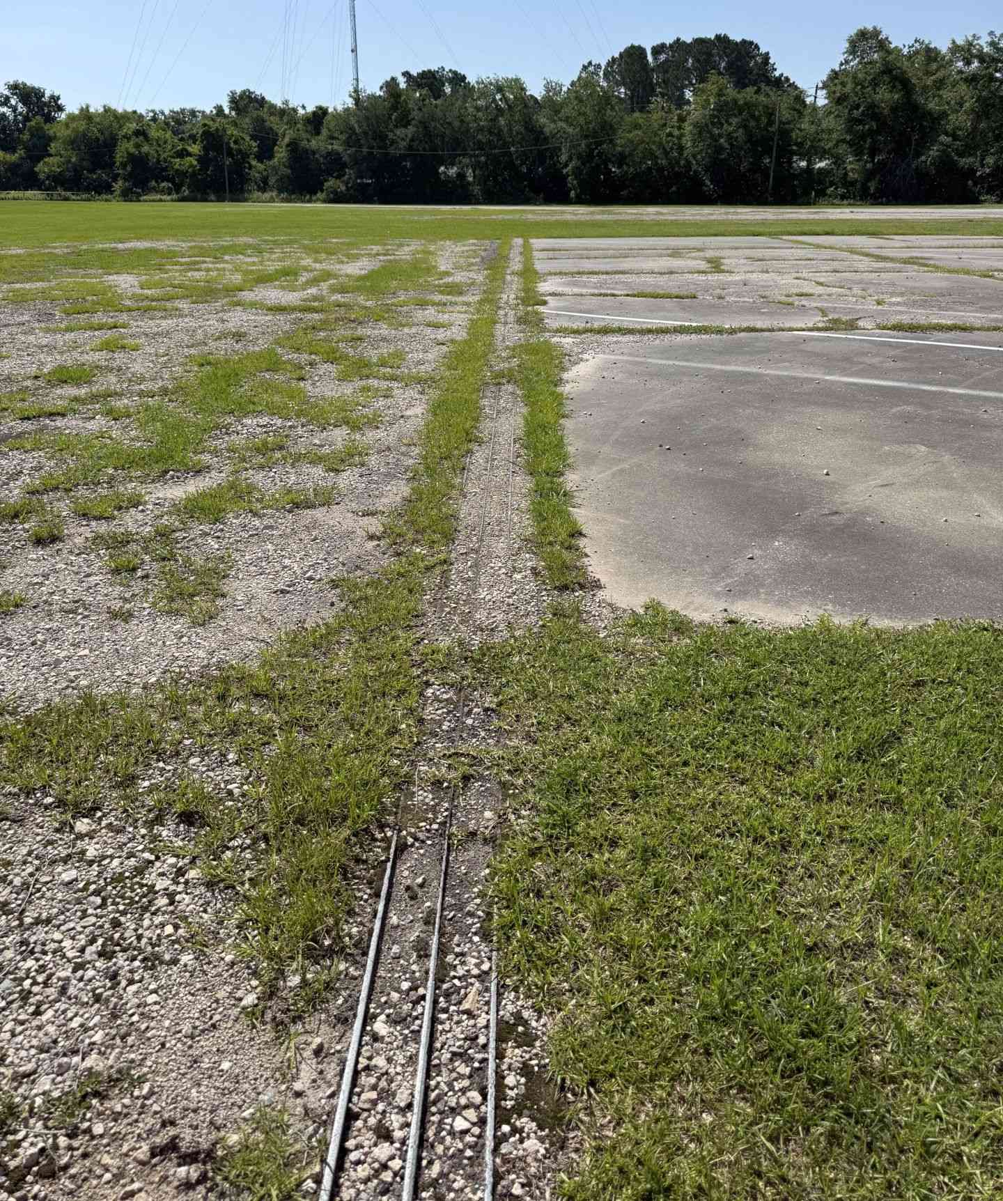 A 2014 aerial view looking northwest at the remains of the Glynco blimp field, with the runway of Glynco Jetport in the background.