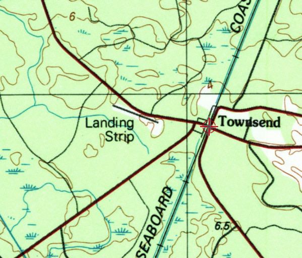 The April 1965 Jacksonville Sectional Chart (courtesy of Lee Corbin) depicted Townsend as a private airfield having a 2,600' unpaved runway, with adjacent circular Restricted Area R-3006 to the west.