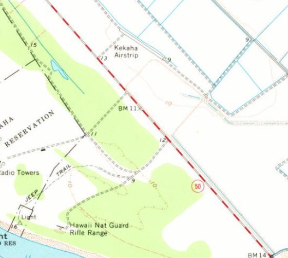 A circa 1980s map (courtesy of Kevin Walsh) depicted Kekaha Airstrip as a single small northwest/southeast runway.