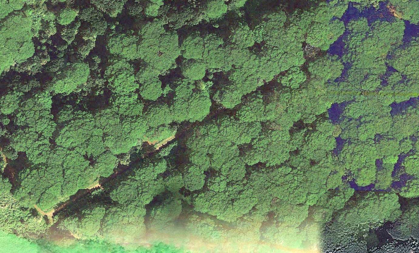 A 2013 aerial view of the site of the Kealia Landing Strip. Kevin Walsh observed, “It has been obliterated by an overgrown forest canopy.”