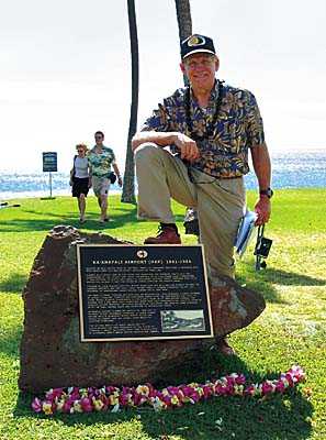 A 2010 photo of pilot Robert Morrison in front of a plaque commemorating Ka'anapali Airport.