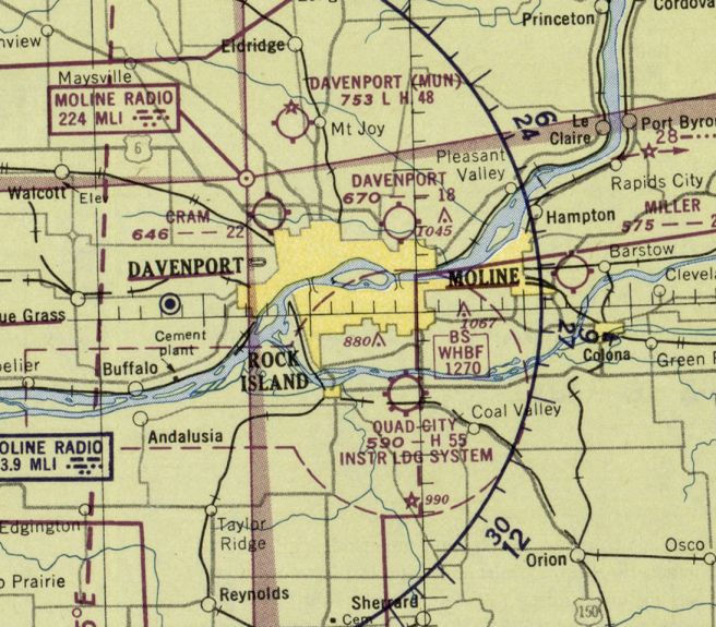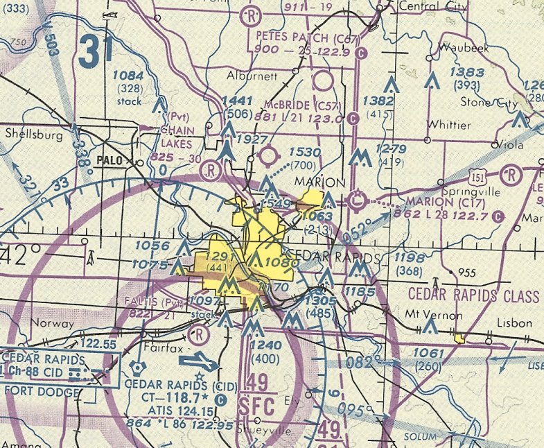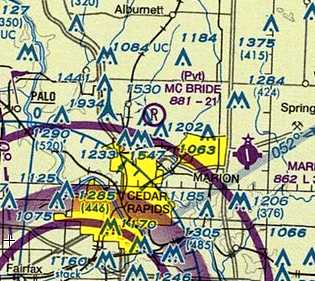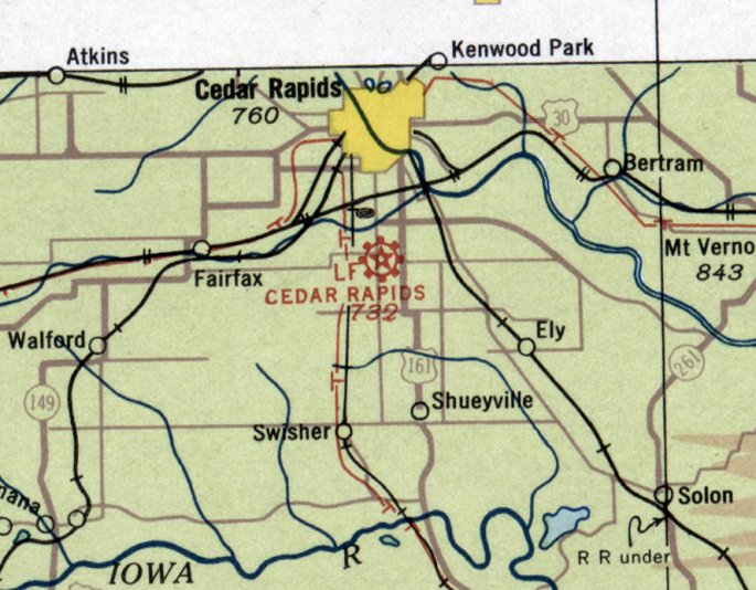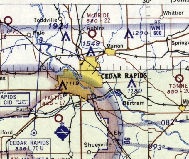 The earliest chart depiction which has been located of the original Cedar Cedar Rapids Municipal Airport was on the September 1934 Des Moines Sectional Chart.